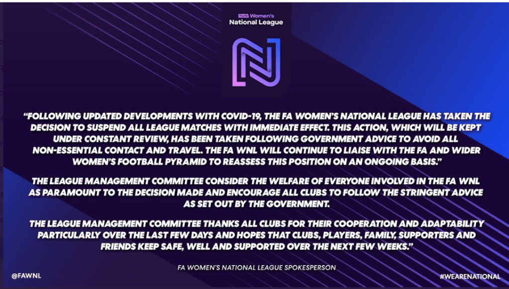 Following the backlash the following evening the Women’s national League FA released a statement confirming that all fixtures would be suspended until further notice.